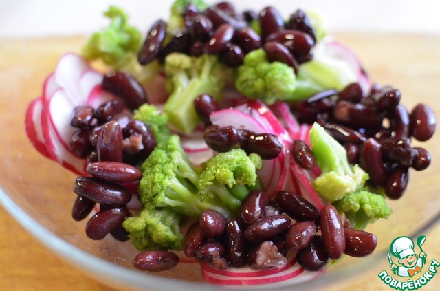 Редиску вымыть, порезать кружочками. Выложить в миску, добавить фасоль, брокколи.