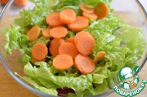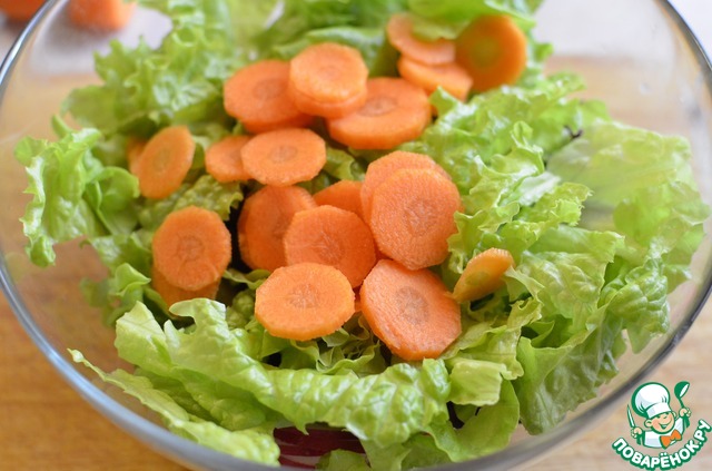 Листья салата, почищенную и порезанную кружочками морковь. Посолить, заправить оливковым маслом. Перемешать. Разделить салат на 2 части.