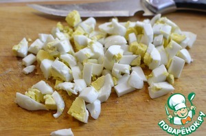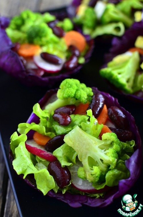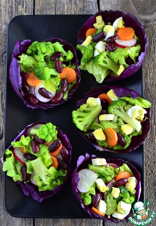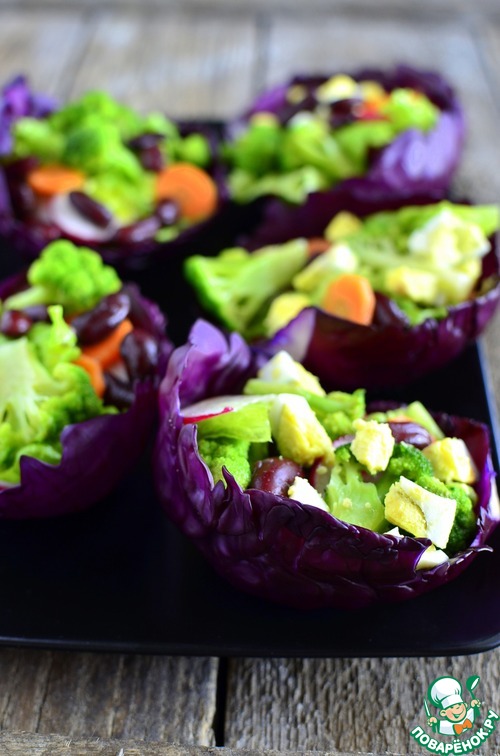 В одну часть добавить отварное яйцо порезанное кубиками. Выложить салат в тарелочки из краснокочанной капусты. Подавать к столу!