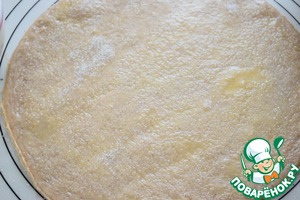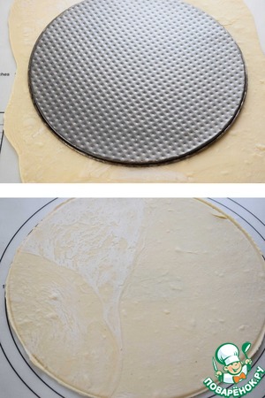 Из слоеного теста (у меня 2 кусочка по 250 г каждый), раскатаем пласт и вырежем круг Ø 25-26 см.