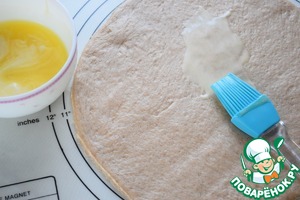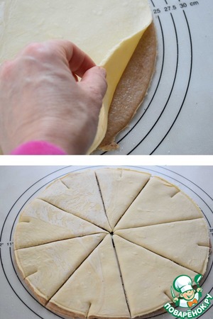 На круг шоколадного теста положить круг слоеного теста, разрезать тесто на 8 сегментов. В середине основания каждого треугольника тоже сделать надрезы длиной около 1-1,5 см.