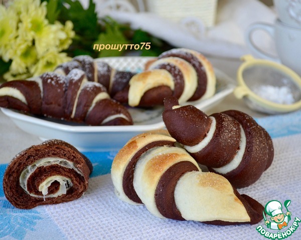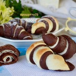 Сегодня я хочу угостить вас, поварята, необычно вкусными рогаликами из двух видов теста: шоколадного дрожжевого и слоеного дрожжевого. Рогалики получаются очень пышными, нежными и ароматными. В них интересно сочетается мягкость одного и хрусткость другого теста. Заходите в гости, будем пить чай! За идею спасибо кулинару Сальвии.