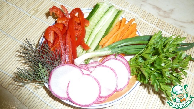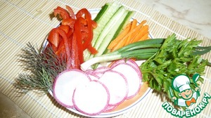 В это время нарезаем овощи соломкой, а редиску кружочками.