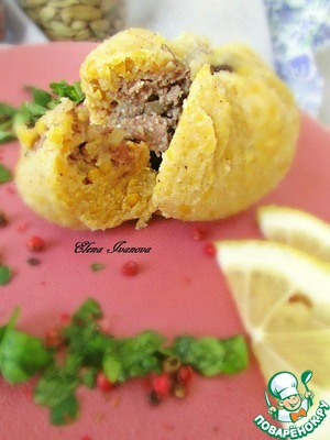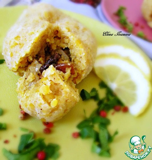Собрать края ткани, закрывая фарш нутовым тестом. С помощью нити завязать узел. С фаршем я так же приготовила четыре топика.