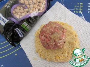 На кусочек тряпочки или марли (ранее неиспользованная) на середину выложить шарик нутового теста. Размять его в лепешку, не доходя до края ткани, примерно 5 см. На центр лепешки выложить фарш.