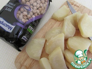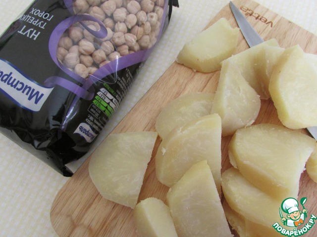 Сварить картофель в мундире. Остудить, почистить и порезать крупными кусочками.