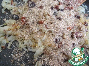 Обжарить на растительном масле до золотистого цвета. Добавить молотые орехи, запаренный изюм, корицу, тмин, сумах и соль (я подсыпала еще чуть-чуть сахарку). Перемешать и выключить огонь. Начинку остудить. (Начинка получается очень вкусная, можно подавать на тостах или жарить с ней пирожки).