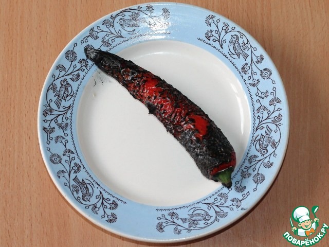 • 3. Перец чили (большой стручок) запечь в духовке или на конфорке,