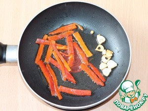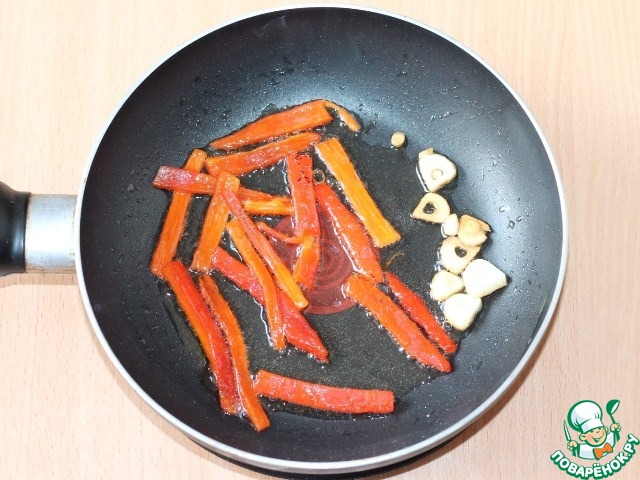 перчик чили и 1 минуту обжариваем. Чеснок удаляем, а перец кладем в миску.