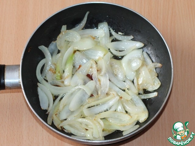 • 6. В чесночное масло кладем порезанный полукольцами репчатый лук и
