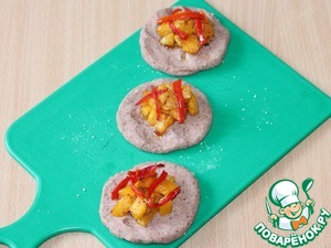 • 11. Приготовим постные зразы. Из трех частей фасолевого фарша делаем лепешки. В каждую лепешку кладем по 1 ст. л. тыквы и немного перчика чили.