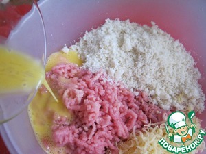Свиной фарш смешать с мякишем, слегка взбитыми яйцами, тёртым сыром. Присолить по вкусу.