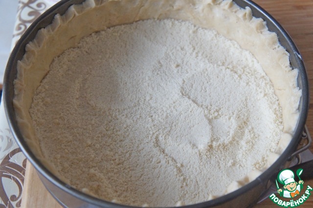 Разъемную форму диаметром 23-24 см застелить бумагой для выпечки, руками распределить тесто, наколоть, убрать в холодильник минимум на полчаса. По истечении времени извлечь форму из холодильника и высыпать в нее измельченный миндаль.