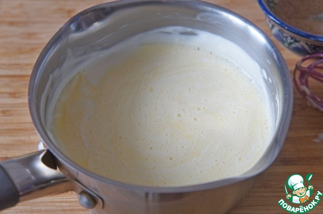 Взбить яйца с четвертью чашки сахара, смешать взбитые яйца со смесью крем-фреша.