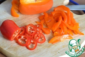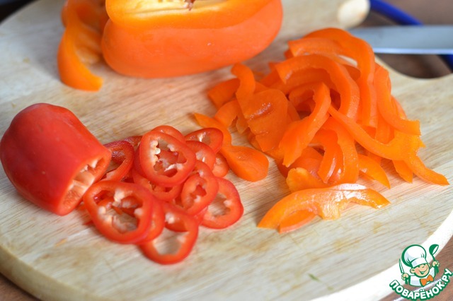 • Нарежем сладкий и чили перец тоненькими ломтиками.