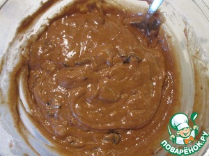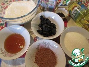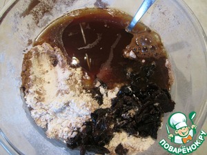 Просеять вместе муку, какао и разрыхлитель. Добавить сахар, растительное масло, чай с медом и чернослив.