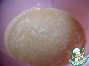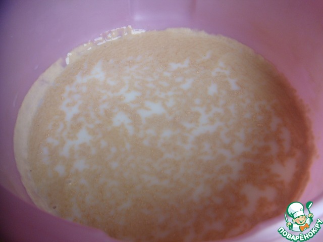 • Смешать воду с молоком, подогреть. Добавить 1 ст ложку сахара, пакетик быстродействующих дрожжей. Оставить на минут 5, чтобы дрожжи активировались.