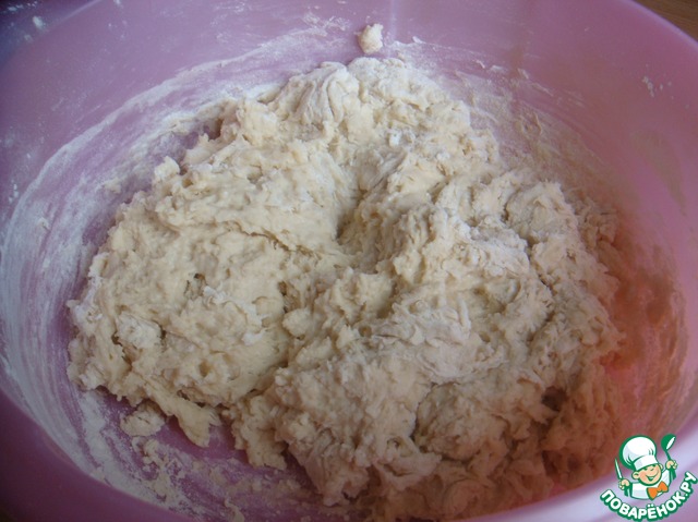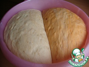 • Складываем обе половинки теста в миску, затянуть пленкой и поставить в теплое место для увеличения в объеме.