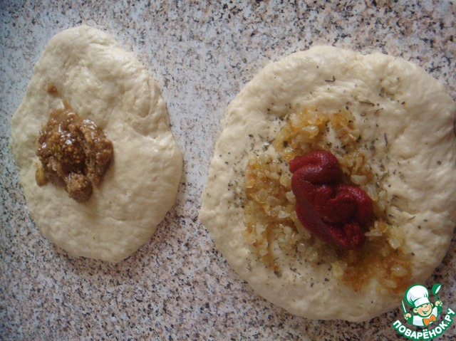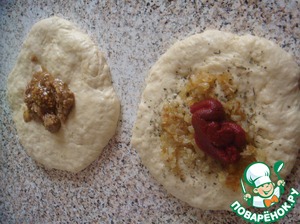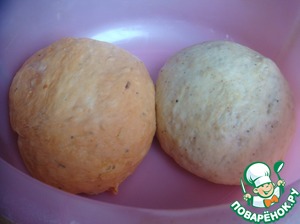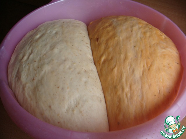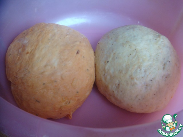 • Разделить тесто на 2 равные части. В одну часть добавила 1 ст ложку томатной пасты, обжаренный с чесноком лук. Во вторую часть добавила 1 ст ложку орехового соуса и 1 чайную ложку дижонской горчицы. И вымешиваем каждую половинку, чтобы наполнители равномерно распределились в тесте. Если потребуется подсыпаем муку.