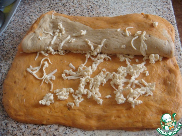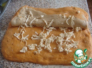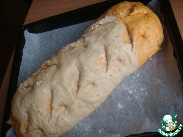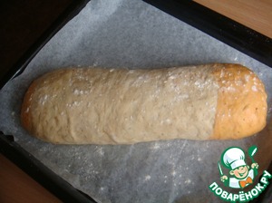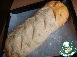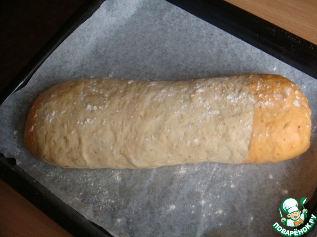 • Свернуть тесто рулетом, выложить на противень выстеленный пергаментом. Затянуть пленкой и оставить еще минут на 30-40 до увеличения в объеме.