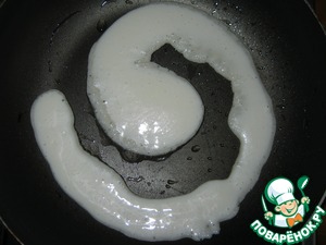 Готовую спираль на тарелку и свернуть от тонкого края к широкому. Перед подачей развернуть, смазать начинкой и опять свернуть розочкой.