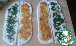 Тесто разделить на 2 части и раскатать каждую. Затем разрезать вдоль каждую часть. Выложить начинку