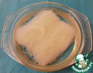 Начнем с подготовки фунчозы. Для этого зальем ее горячей водой на 30 минут, согласно инструкции на упаковке.