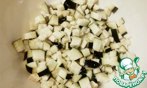 Теперь подготовим овощи. Баклажан нарезать кубиком, посолить, дать постоять 15 минут, затем откинуть на дуршлаг и промыть холодной водой. Дать стечь воде.