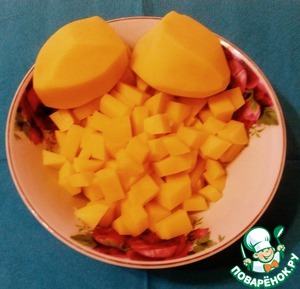 Ставим воду на огонь. Пока она закипит, нарезать кубиком 2 больших картофеля. Маленький картофель положим целым. В середине варки посолить.