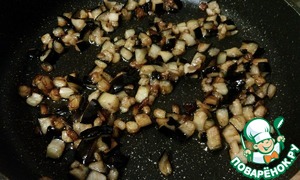 Попутно на второй сковороде, на таком же масле, обжарить до румяности баклажан.