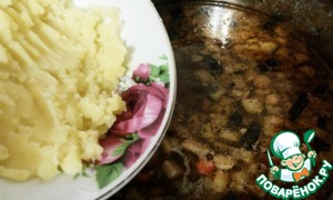 К этому времени картофель готов. Вынуть из супа 2 целых картофеля, а в суп выложить содержимое двух сковород. Дать закипеть.