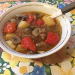 Горячий картофель размять вилкой и вернуть в суп. Добавить перец, хмели- сунели, попробовать на соль.