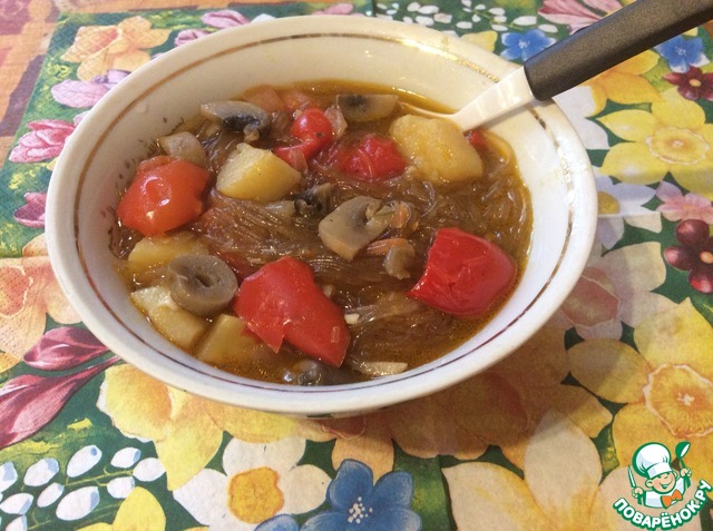 Завершающий этап - фунчоза и укроп. Все вместе кипит 2 минуты и суп готов.