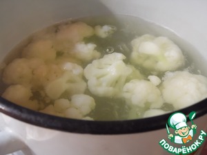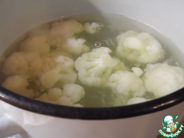 Цветную капусту разобрать на соцветия, отварить в кипящей подсоленной воде до готовности.