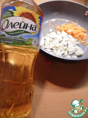 Лук мелко нашинковать, морковь натереть на крупной терке. Подготовленные овощи обжарить на растительном масле ТМ "Олейна" 3-4 минуты.