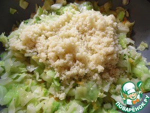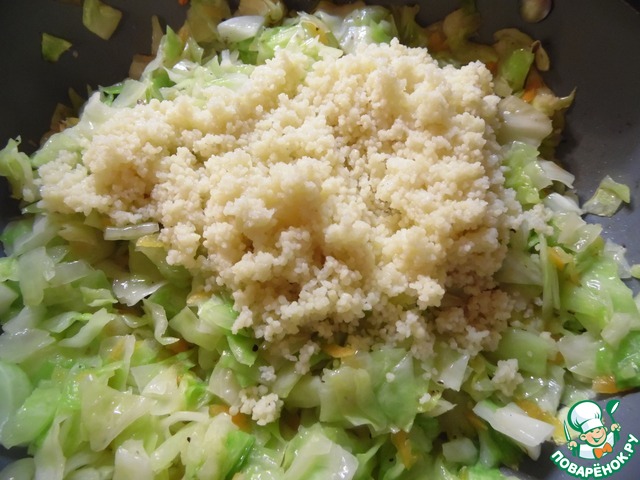 В капусту добавить кус-кус, перемешать, тушить 2-3 минуты.