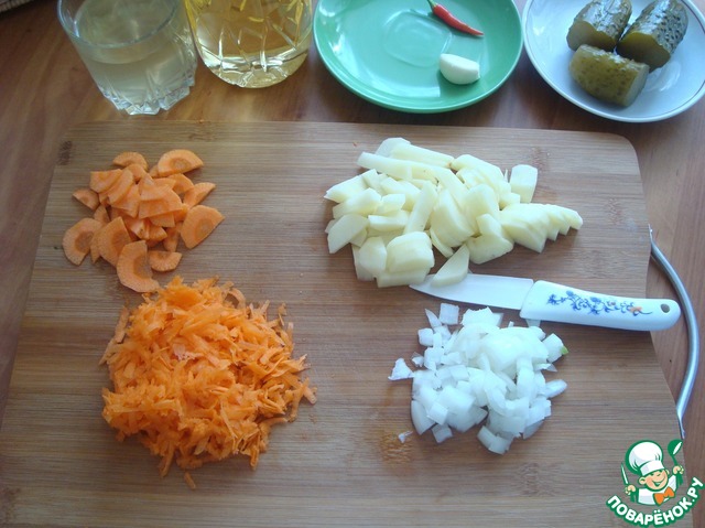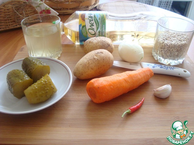 Постный рассольник с перловой крупой и маринованными огурцами, острый. Замечательное первое в пост.
