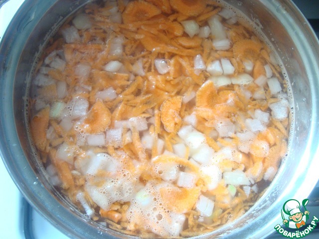 Воду наливаем в кастрюлю, доводим до кипения и выкладываем перловую крупу, которую можно замочить предварительно или просто сразу положить. Варим перловку 15 минут примерно.