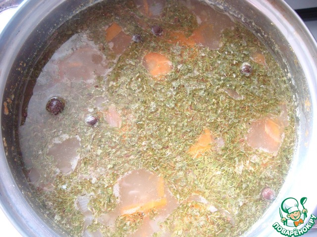 Отправляем специи в кастрюлю и добавляем подсолнечное масло. Ещё всё варим минут 5 до полной готовности рассольника.