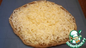 Выкладываем макароны в один ряд. Заливаем яйцом. Сверху натираем сыр.