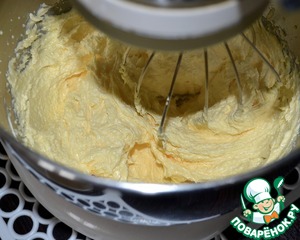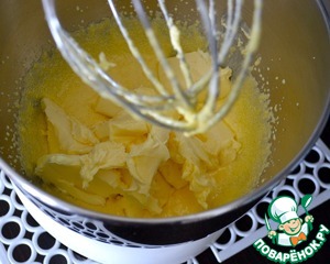 Перым делом у яиц отделить белки от желтков. Белки убрать в холодильник (их будем использовать в крем), а желтки взбить с сахаром до растворения сахара. Добавить к желткам размягченное масло.