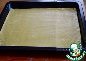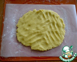 Тесто достать из холодильника и разделить на 3 равные части (примерно по 370 г). При этом будем выпекать торт на противне, но я выпекала его и в круглой разъемной форме 26 см, и в этом случае, тесто делим на 4 части, т. к. получаются 4 круглых коржа. Итак, форму и размер коржей определяем по своему желанию, вырезаем соответствующие нашим коржам круги (или прямоугольники) из бумаги для выпечки. Первый кусок теста выложить по центру прямоугольника из пекарской бумаги, слегка расплющить лепешку руками.