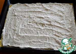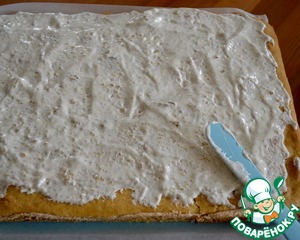 Теперь также между двух листов пекарской бумаги раскатать второй корж. Снять верхний лист, двумя руками перенести и перевернуть второй корж на крем, осторожно снять оказавшуюся наверху бумагу. Советую для уверенности, перед раскатыванием теста слегка присыпать листы бумаги мукой, чтобы в последствии лист без проблем отделялся от тонкого коржа... Итак, второй корж также смазать кремом.