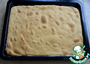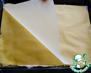 Перенести корж вместе с нижним листом пекарской бумаги на противень (верхний лист бумаги снять).