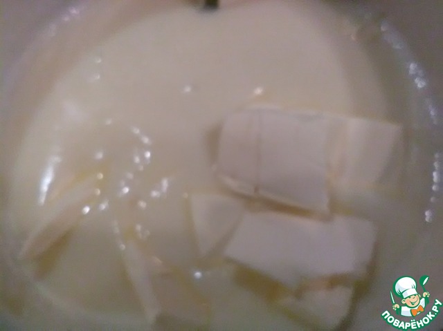 Когда молоко закипит, убавляем огонь и тоненькой струйкой выливаем в него яичную массу, при этом постоянно помешивая. Мешаем до момента закипания. Масса загустеет. Когда начнет закипать, убираем кастрюлю с огня и добавляем нарезанное на кусочки масло. Взбиваем до получения однородной массы. и оставляем, чтобы крем остыл, иногда перемешиваем