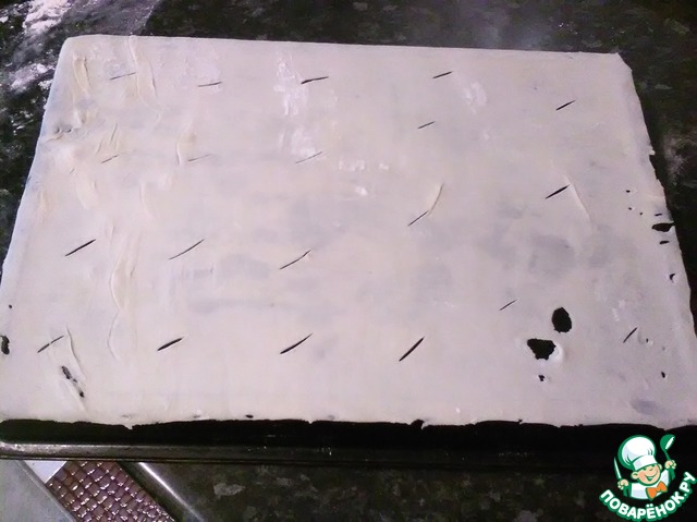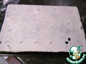 Из данного теста получаются 10 коржей размером 25х30 см. Отрезаем от теста кусочек и раскатываем его на припудренном мукой столе, как можно тоньше. Остальное тесто пока находится в холодильнике. Раскатанный пласт укладываем на перевернутый противень и отрезаем края ровно. Отходы отправляем к тесту в холодильник. ОБЯЗАТЕЛЬНО ДЕЛАЕМ НАДРЕЗЫ ПО ВСЕМУ КОРЖУ. -