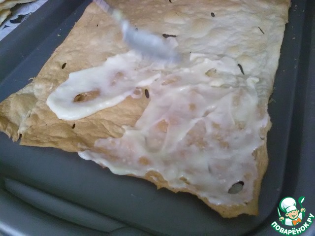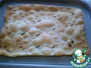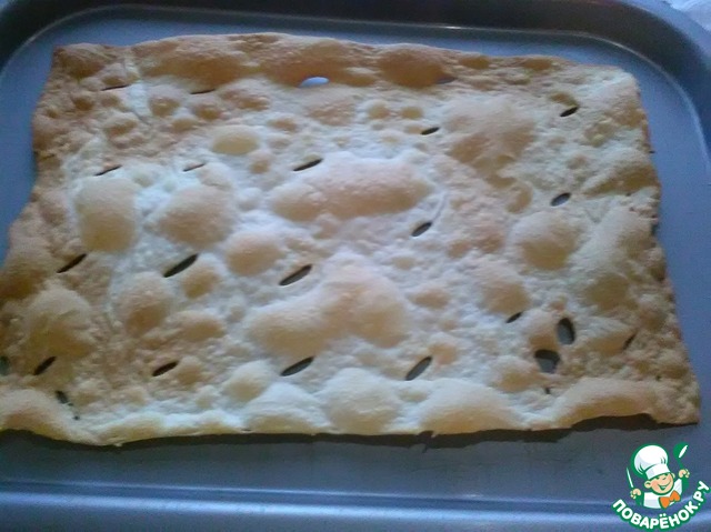 Отправляем в духовку на 5-6 минут, а в это время успеваем раскатать следующий пласт теста. Вынимаем первый и отправляем в духовку второй. Вот так выглядит первый корж
