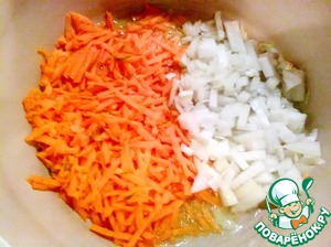 Люблю, когда цвет борща задает морковь, поэтому трем на терке большую морковь, режем лук и отправляем жариться в керамическую кастрюлю, налив подсолнечное масло (можно жарить отдельно в сковороде, потом добавить в борщ).