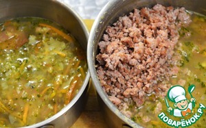 Делим суповую основу на две части. В одну добавляем фарш. Ставим обе части на огонь.