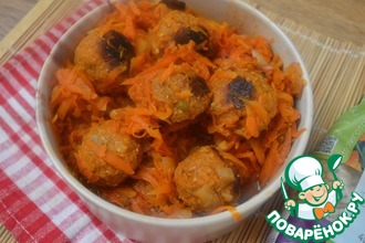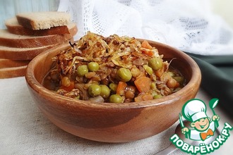 Разделяем тушёные овощи на две части. В скоромную часть добавляем мясные продукты, перемешиваем и тушим ещё минут 7-10.